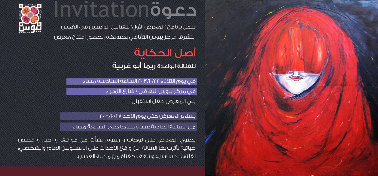 دعا مركز "يبوس" الثقافي، في القدس، لحضور افتتاح معرض "أصل الحكاية"، للفنّانة الواعدة "ريما أبو غزالة"، يوم الثلاثاء، 22 أكتوبر 2013، الساعة السادسة مساءً (18:00)، وذلك ضمن برنامج المعرض الأوّل للفنّانين الواعدين.