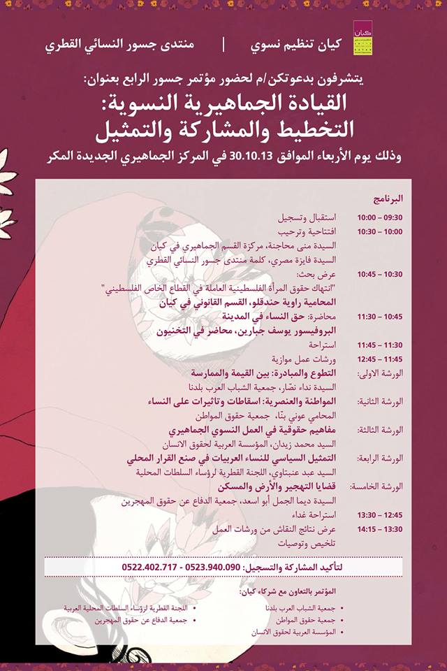 تنظّم جمعيّة "كيان" -تنظيم نسوي، مؤتمر "جسور" الربع، تحت عنوان: "القيادة الجماهيريّة النسويّة: التخطيط والمُشاركة والتمثيل"، يوم الأربعاء، 30 أكتوبر/ تشرين أوّل 2013، في المركز الجماهيري، في المكر.