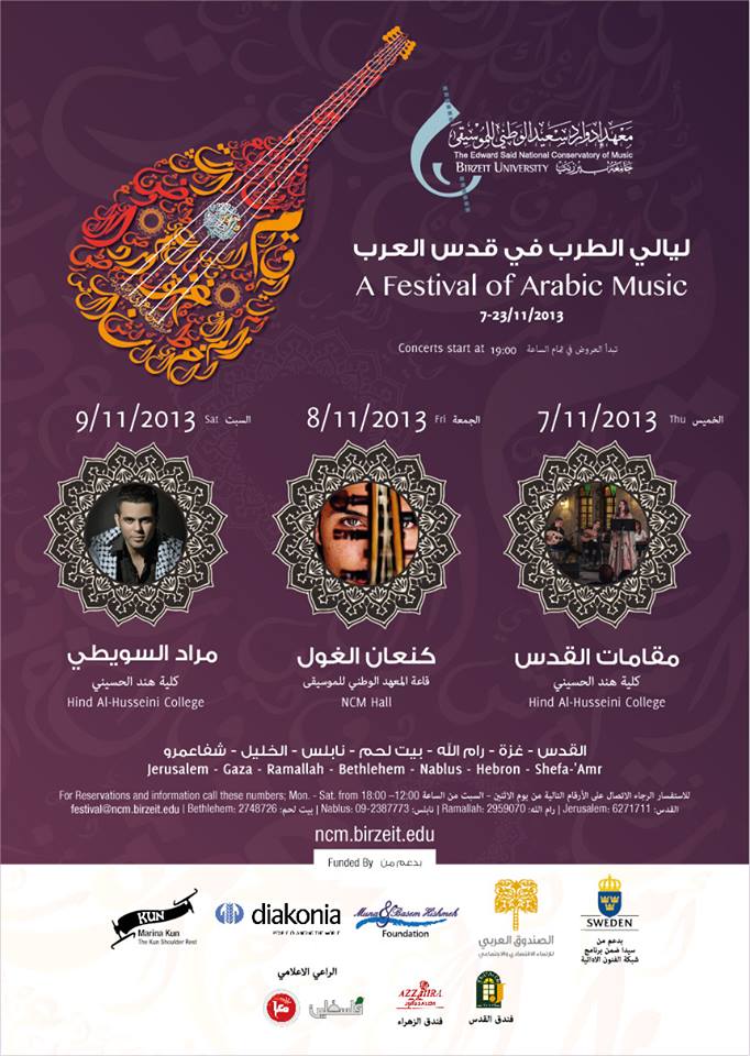أعلن معهد إدوارد سعيد الوطني للموسيقى، عن مهرجان "ليالي الطرب في قدس العرب"، والذي يُفتتح يوم الخميس، 7 نوفمبر/ تشرين ثاني 2013، في كليّة هند الحُسيني، في عرض فنّي لفرقة "مقامات القدس".