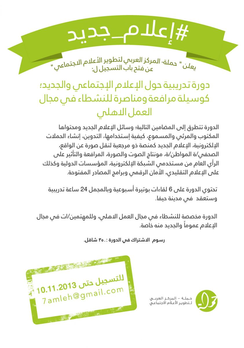 أشار إعلان "حملة" -المركز العربي لتطوير الإعلام الاجتماعي- أنّ الموعد النهائي للتسجيل لدورة "#إعلام_جديد" هو السابع عشر من تشرين الثاني/ نوفمبر 2013. ومن الجدير بالذكر أنّ "حملة" ستبدأ دورة تدريبيّة إضافيّة في النقب، في بداية شهر كانون الأول/ ديسبمر القادم.