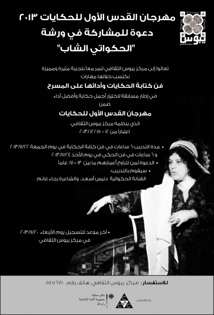 ينظّم مركز "يابوس" الثقافي ورشة "الحكواتي الشاب"، والتي تُكسب مهارات في كتابة الحاكايات وأدائها على المسرح، في إطار مُسابقة لاختيار أجمل حكاية وأفضل أداء، ضمن مهرجان القدس الأوّل للحكايات، من 12 ديسمبر/ كانون أوّل 2013، وحتّى 15 ديسمبر/ تشرين ثاني.
