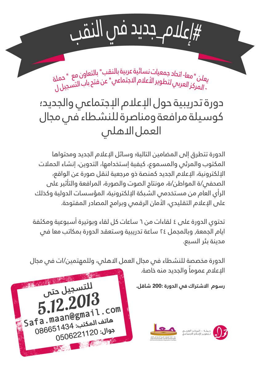 أشار إعلان "حملة" -المركز العربي لتطوير الإعلام الاجتماعي- أنّ الموعد النهائي للتسجيل لدورة "#إعلام_جديد" هو السابع عشر من تشرين الثاني/ نوفمبر 2013. ومن الجدير بالذكر أنّ "حملة" ستبدأ دورة تدريبيّة إضافيّة في النقب، في بداية شهر كانون الأول/ ديسبمر القادم.