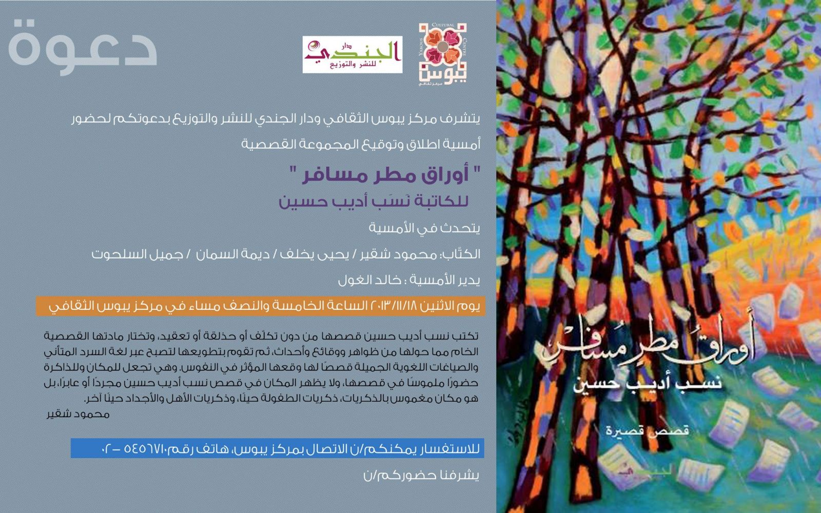 دعا مركز "يابوس" الثقافي، بالتعاون مع "دار الجُندي" للنشر والتوزيع، لأمسية إطلاق وتوقيع المجموعة القصصيّة "أوراق مطر مُسافر"، للكاتبة "نسب أديب حسين"، وذلك يوم الإثنين، 18 نوفمبر/ تشرين ثاني 2013، في مركز "يابوس"، في شارع الزهراء في القدس.