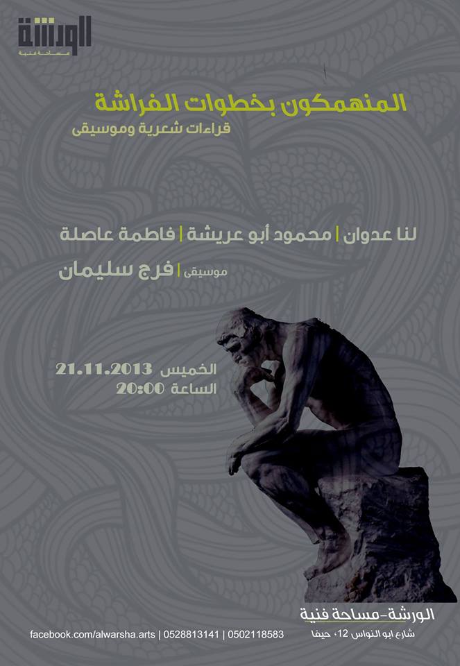 تحت عنوان "المنهمكون بخطوات الفراشة"، تنظّم "الورشة" -مساحة فنيّة- أمسية شعرية موسيقيّة في حيفا، يوم الخميس 21.11.2013، في الساعة الثامنة مساءً (20:00).