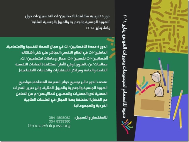 أعلنت "القوس" عن دورة تدريبيّة مُكثّفة للأخصّائيين النفسيين، تحت عنوان : "الهويّة الجنسيّة، والجندريّة، والميول الجنسية المثليّة"، والتي ستُقام في مدينة يافا، في يناير/ كانون الأوّل 2014.