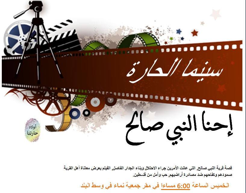 دعت مجموعة "أولاد حارتنا" في بيت صفافا، لحضور عرض فيلم " إحنا النبي صالح"، وهو الفيلم الرابع من سلسلة "سينما الحارة"، يوم الخميس، في الساعة السادسة مساءً (18:00)، في جمعيّة "النماء".