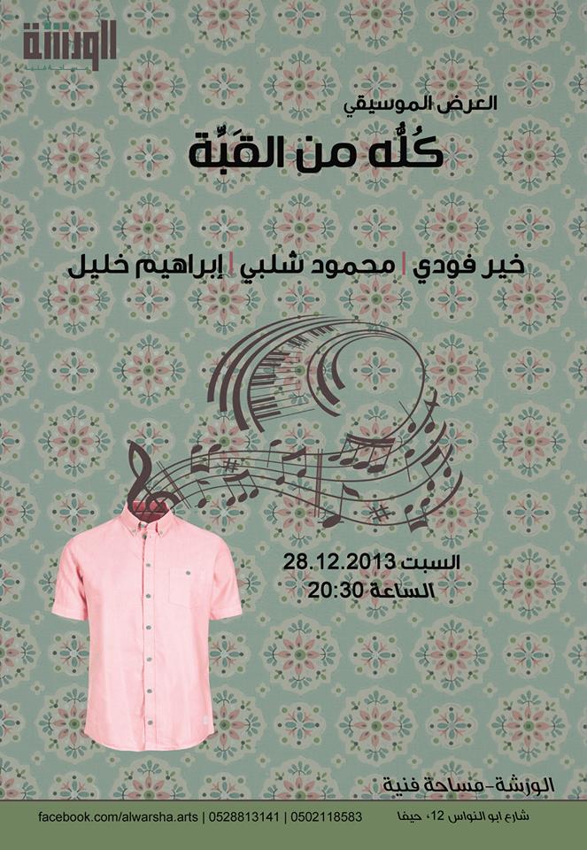 دعت "الورشة" -مساحة فنيّة- لحضور العرض الموسيقى "كلّه من القبّة"، على المنصّة الشتويّة في "الورشة"، والذي يُشارك به كلّ من الفنّانين: خير فودي؛ محمود شلبي؛ إبراهيم خليل، وذلك يوم السبت، 28 ديسمبر/ كانون الأوّل 2013، في تمام الساعة الثامنة والنصف مساءً (20:30).