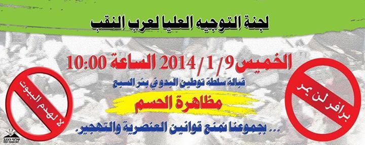 دعت لجنة التوجيه العليا لعرب النقب لما أسمتها "مظاهرة الحسم"، تصدّيًا لمُخطّط "برافر" الاقتلاعي، ورفضًا لهدم البيوت، وذلك يوم الخميس، 9 يناير/ كانون الأوّل 2014، مقابل بناية "سلطة توطين البدو"، في مدينة بئر السبع، في تمام الساعة العاشرة صباحًا (10:00).