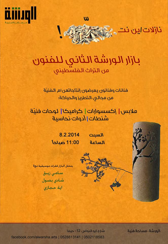 تُنظّم الورشة -مساحة فنيّة- بازار الفنون الثاني (من التراث الفلسطيني)، يوم السبت، 8 شباط/ فبراير 2014، من الساعة الحادية عشر صباحًا (11:00).