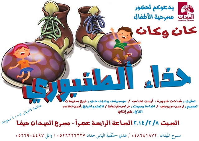 دعا مسرح "الميدان" لحضور مسرحيّة الأطفال "حذاء الطنبوري"، يوم السبت، 8 شباط/ فبراير 2014، في الساعة الرابعة عصرًا (16:00).