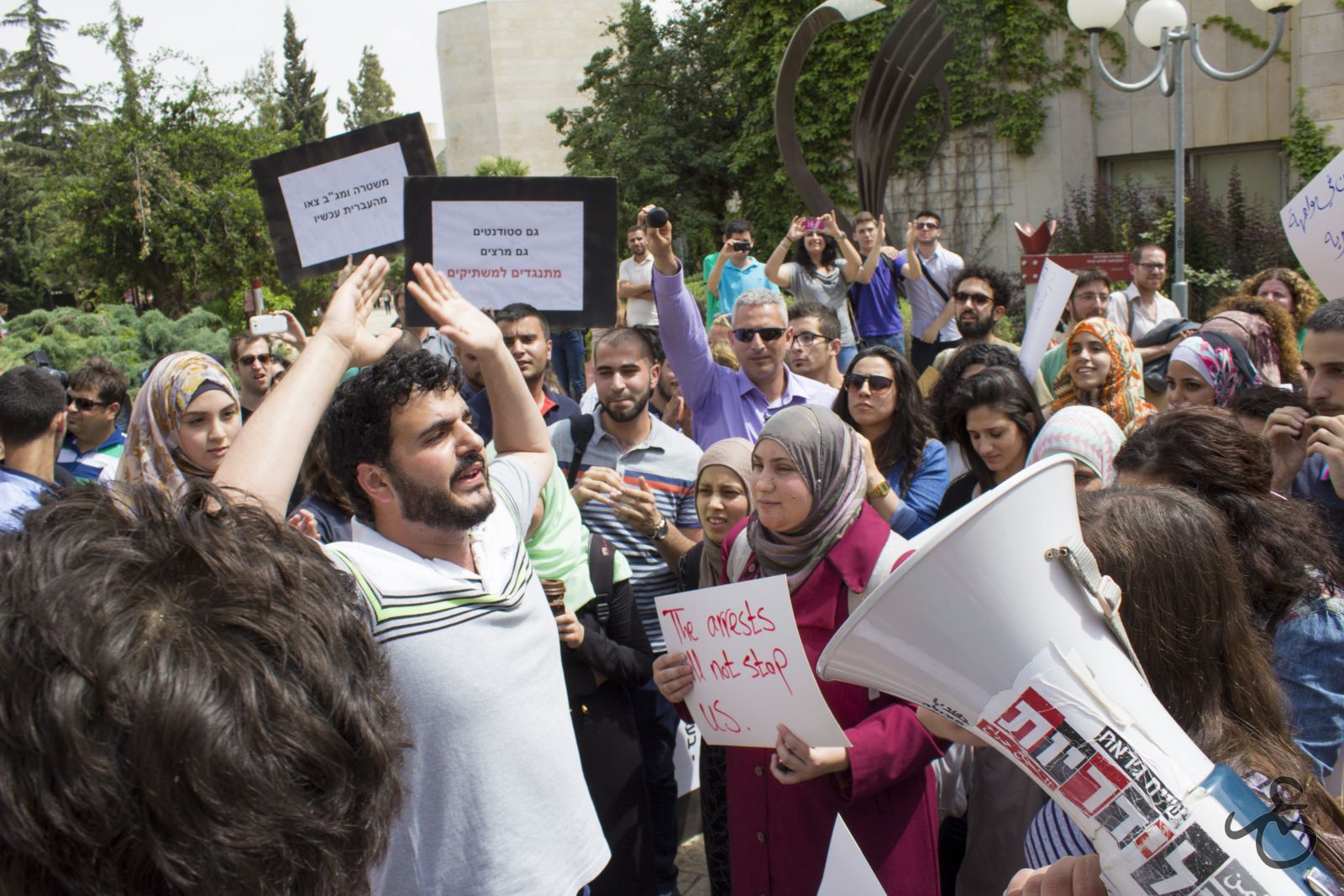 شارك المئات من الطلّاب العرب في الجامعة العبريّة في القدس، يوم الأربعاء 7 أيّار/ مايو 2014، في مظاهرة احتجاجيّة على مخطّط التجنيد للجيش الإسرائيليّ، ورفضا لقمع حريّة التعبير التي تمارسها الجامعة ضدّ الطلّاب العرب.