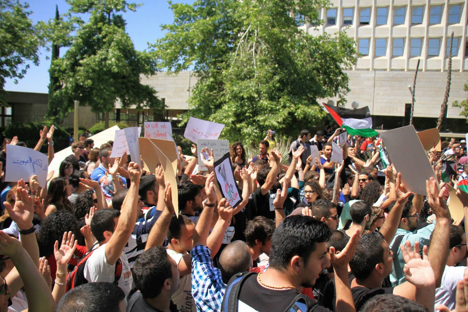 تظاهر يوم الأربعاء، 14 أيّار/ مايو 2014، الطلّاب العرب في الجامعة العبريّة في القدس، في ذكرى النكبة، ضد مخطّطات تجنيد الشباب العرب في الجيش الإسرائيلي، وضدّ قمع الجامعات لحريّة التعبير، وهتفوا دعمًا للأسرى الفلسطينيين المُضربين عن الطعام، وتظاهر بالجهة المقابل نشطاء الحركات الصهيونيّة المتطرّفة، رافعين الشعارات المُعادية للعرب.