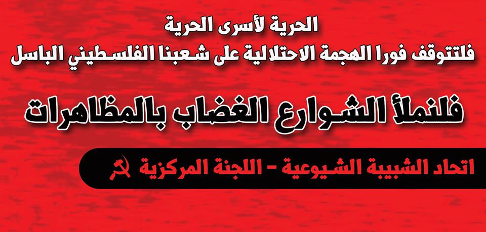 دعت اللجنة المركزية للشبيبة الشيوعية، في اجتماعها الدوري، نهاية الأسبوع الأخير، إلى أوسع وحدة كفاحية لصد العدوان الاحتلالي عن الشعب العربي الفلسطيني المناضل من أجل الحرية والاستقلال، وأكدت التجند التام للمظاهرتين اللتين تم الاعلان عنهما، غدا الأربعاء في حيفا والجمعة القريب في أم الفحم، كما دعت إلى سلسلة من التظاهرات في مختلف البلدات، يوم السبت، الـ٢٨ من الشهر الجاري.