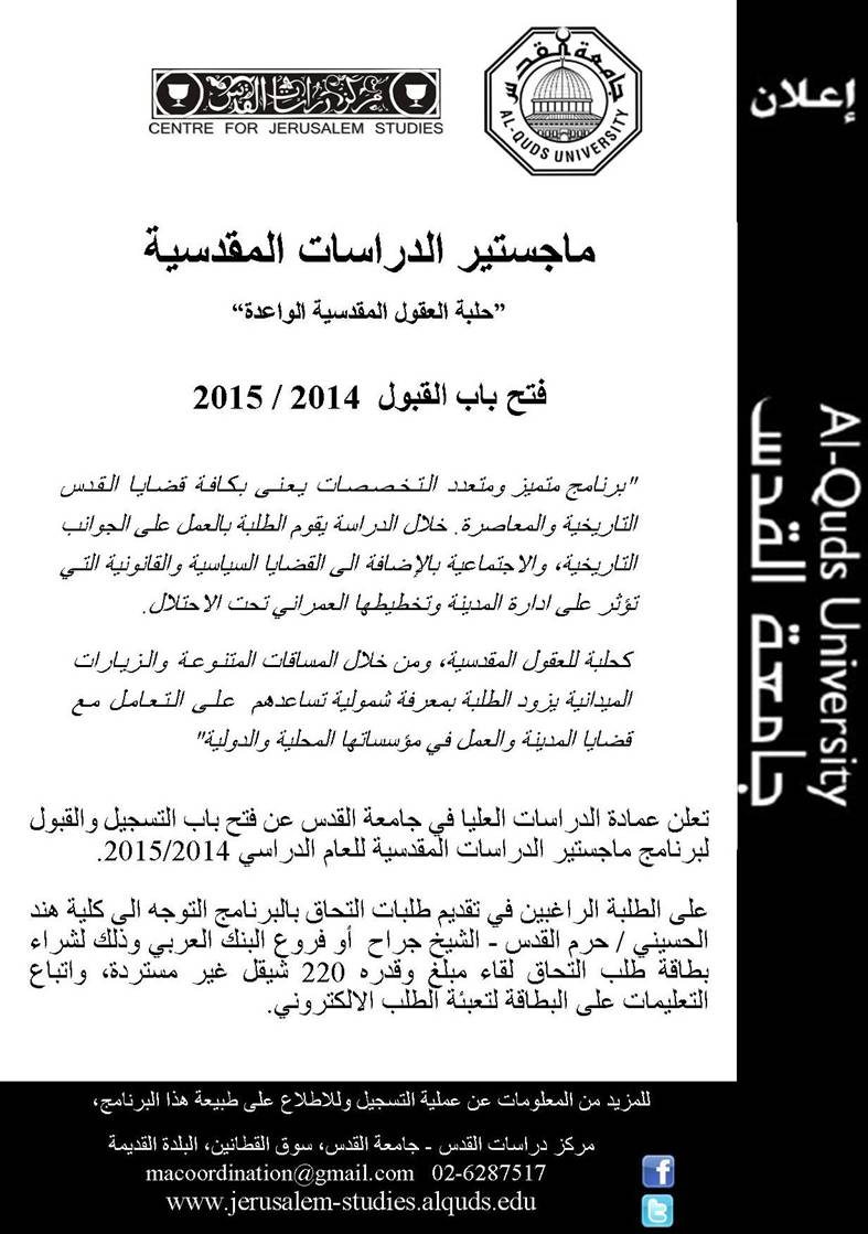 » جامعة القدس: فتح باب القبول للماجستير في الدراسات المقدسيّة؛ "حلبة العقول المقدسيّة الواعدة"